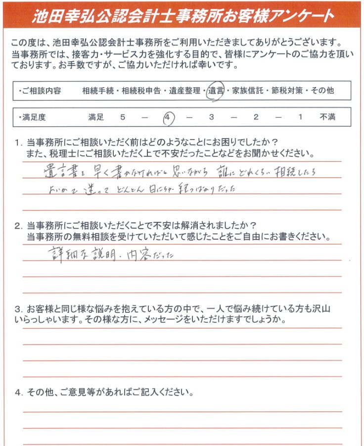 遺言書を早く書かなければと思いながら、誰にどれくらい相談したらよいのかで迷ってどんどん日にちが経つばかりだった。
