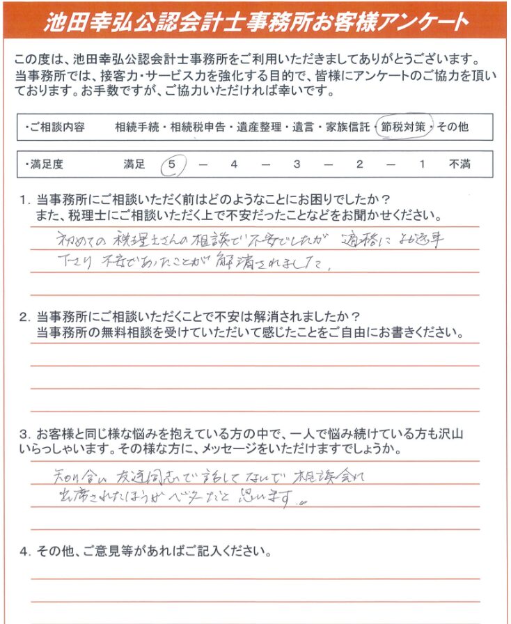 初めての税理士さんの相談で不安でしたが、的確にお返事くださり不安であったことが解消されました。